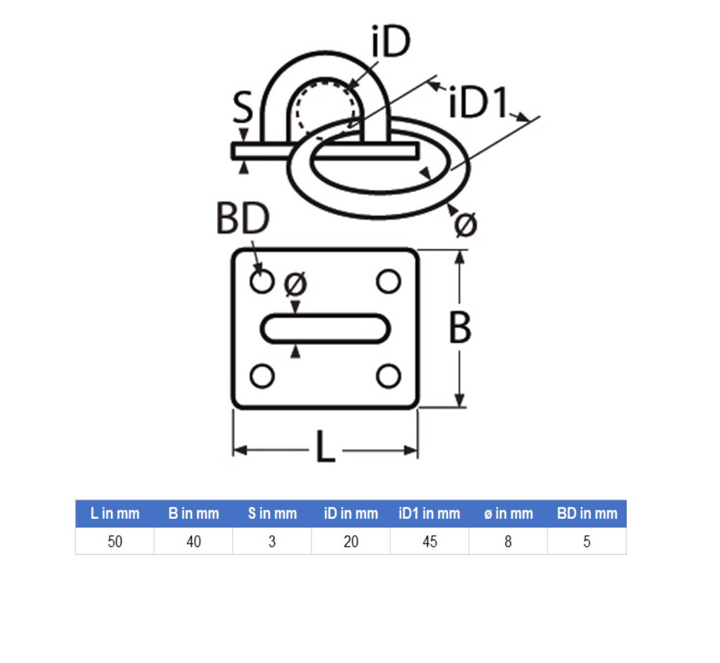 Länge: 50mm ; Breite: 40mm ; Stärke: 3mm ; Bohrloch-Durchmesser: 5mm