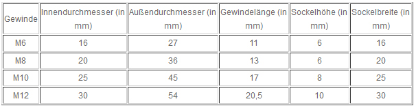 | Gewinde | Innendurchmesser (in mm) | Außendurchmesser (in mm) | Gewindelänge (in mm) | Sockelhöhe (in mm) | Sockelbreite (in mm) |