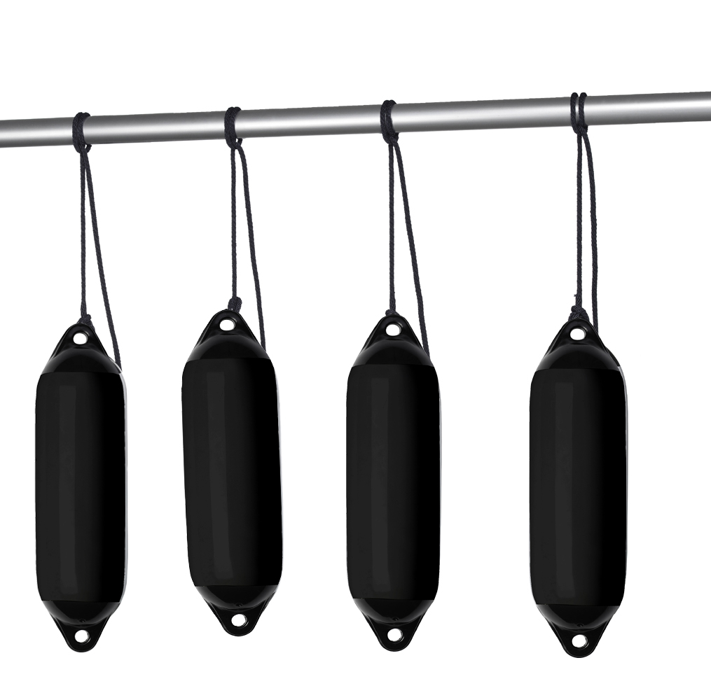4er Set Fender aus UV beständigem PVC mit geöster Leine. Eine besonders starke Ausführung mit starken Ösen und bewährten Rückstoßventilen. Er ist in der Waagerechten sowie in der Senkrechten verwendbar. Grundfarbe des Fenders ist schwarz, die Kappen sind schwarz. 4x Länge: 580 mm Durchmesser: 150 mm Passen für Fenderkörbe bis 203 und 223 mm Durchmesser