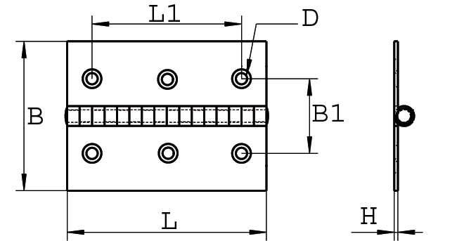 Scharnier aus hochwertigem Edelstahl AISI304 , gestanzt Maße L: 60mm L1: 40mm B: 40mm B1: 25mm D: 5mm H: 1,5mm