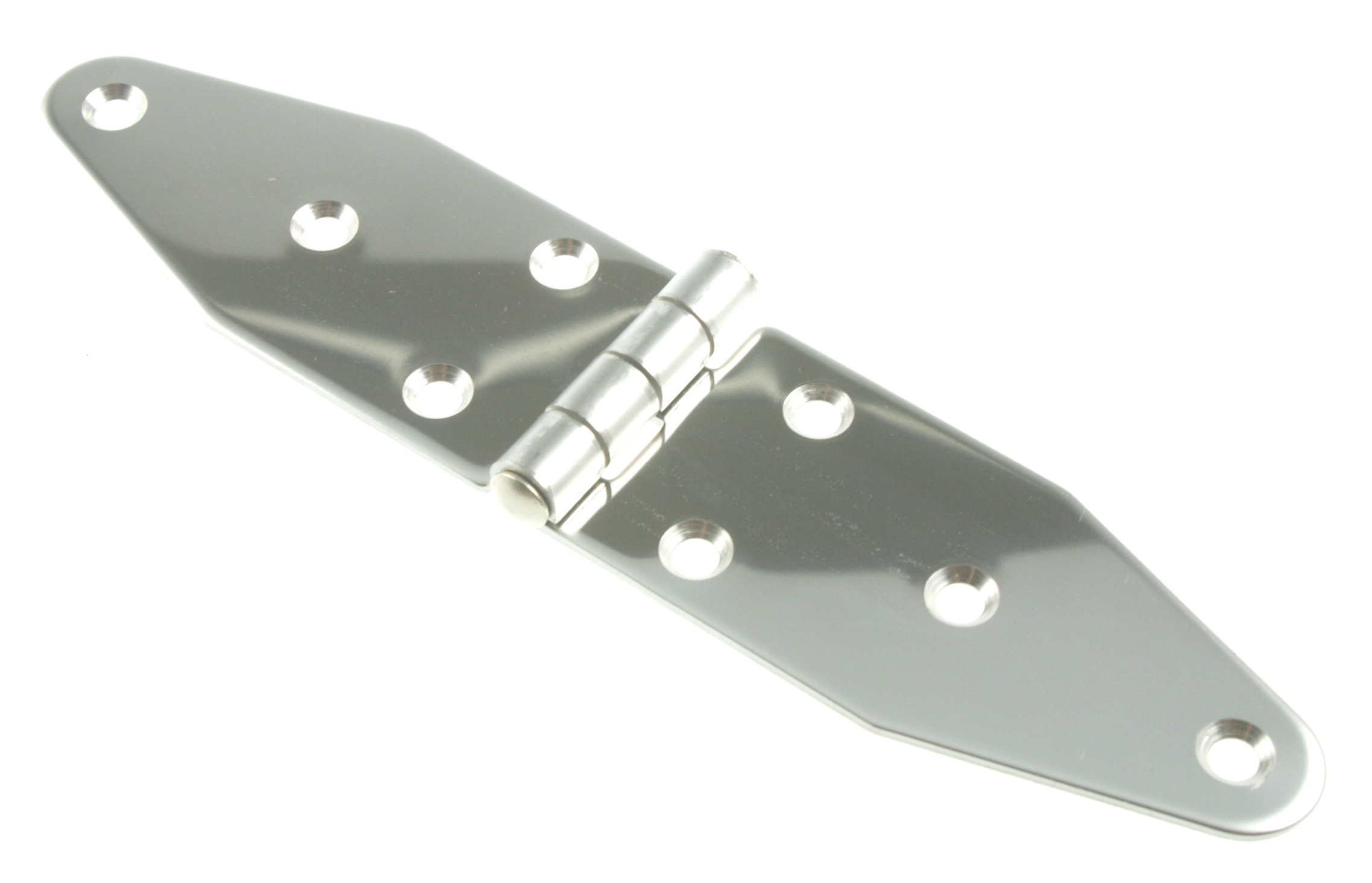 Edelstahlscharnier in bester Qualität mit hochglänzend polierter Oberfläche. Dieses Scharnier ist aus hochwertigem Edelstahl hergestellt und ist absolut rostfrei. Maße: Länge: 180mm (90mm + 90mm) Breite: 40mm Stärke: 2,0mm 8 Befestigungsbohrungen (Durchmesser 5mm).