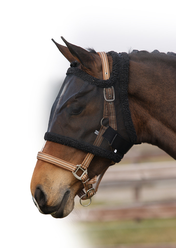 Fliegenmaske mit robustem Netz über den Augen, welches sicherstellt, dass die Maske dem Pferd nicht auf den Augen liegt.