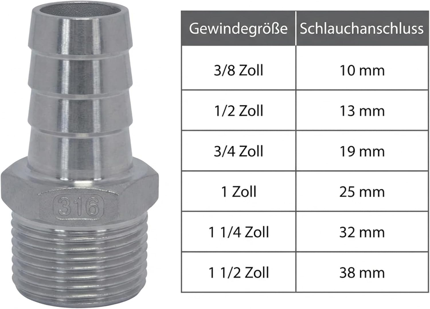 HOCHWERTIGES MATERIAL: Der ARBO-INOX Schlauchanschluss besteht aus robustem Edelstahl A4 und ist dadurch korrosionsbeständig. Vielseitig einsetzbar im Sanitärbereich, Garten oder Boot.